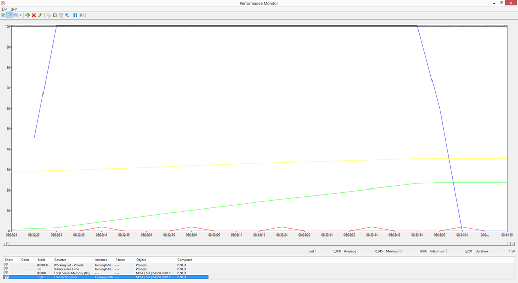 The LINQ Join operator is in this scenario disastrous. The test application consumed in short time whole memory and the CPU was also pretty busy. The problem of the Join operator is that he can’t produce useful query when creating join with the memory collection. The result is that the Join operator is loading the whole table data in the memory (in this case about 11 000 000 entities) and performs the join operation there. Keep this in mind when are you using Join with memory collection on one and database on other side.