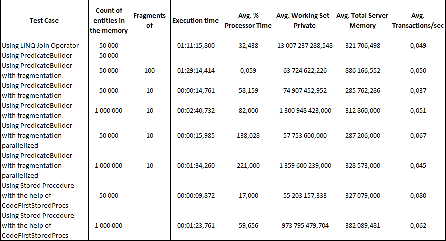The test with Stored Procedure performs very good when the count of entities in the memory is lower, but by 1 000 000 entities is the execution time almost the same as with the PredicateBuilder parallelized version.