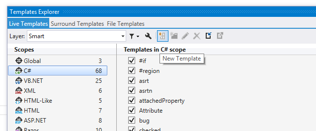 In the Template Explorer choose in Scopes C# and then click on the New Template