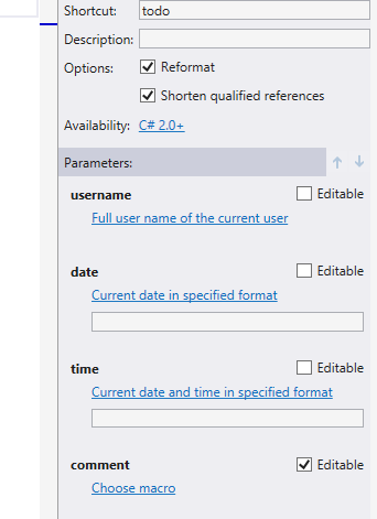 You assign Macro for each parameter as shown above and uncheck the Editable availability, except for the comment parameter. You save the template and you are ready to go. You can setup in the ReSharper Options Menu which items should be shown in To-do Explorer. ![]()