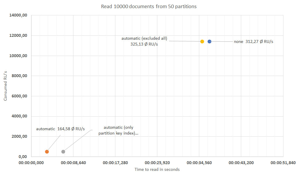 How indexing important is can be seen by working with high load. By reading 1000 documents index hasn’t much impact on read time. But already here was visible that not indexed containers consumed as much as double of RU/s more towards indexed. But the real drama can be seen by not indexed containers when reading 10000 documents. Not indexed containers consumed as much as 21 times more RU/s as indexed, the read time increased by twelvefold.