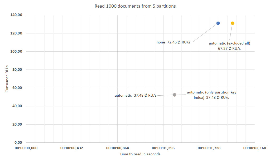 | Indexing policy | Count of Documents | Count of Partitions | Read time | Read RU/s | Average Read RU/s |