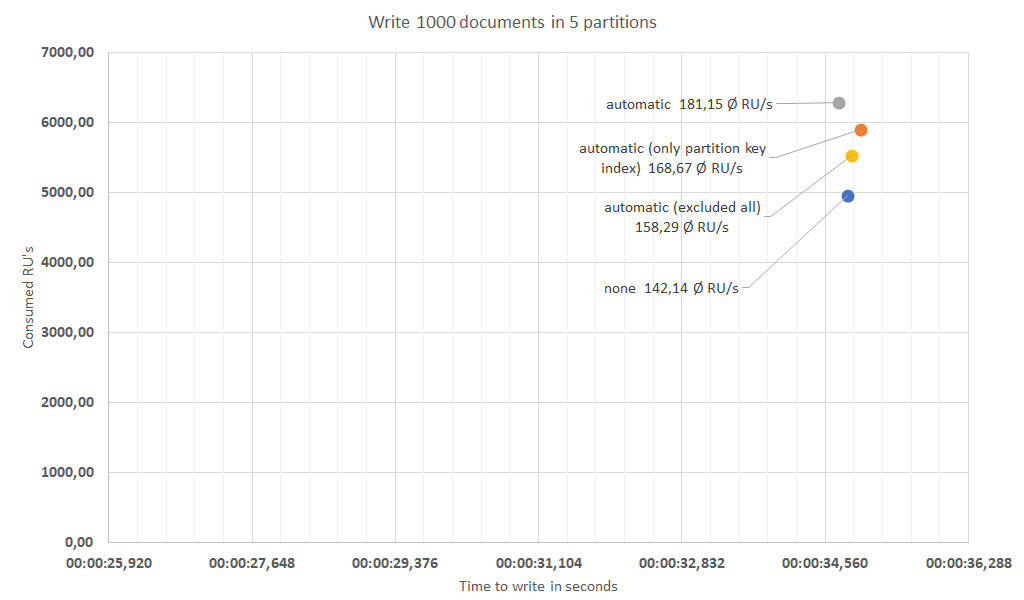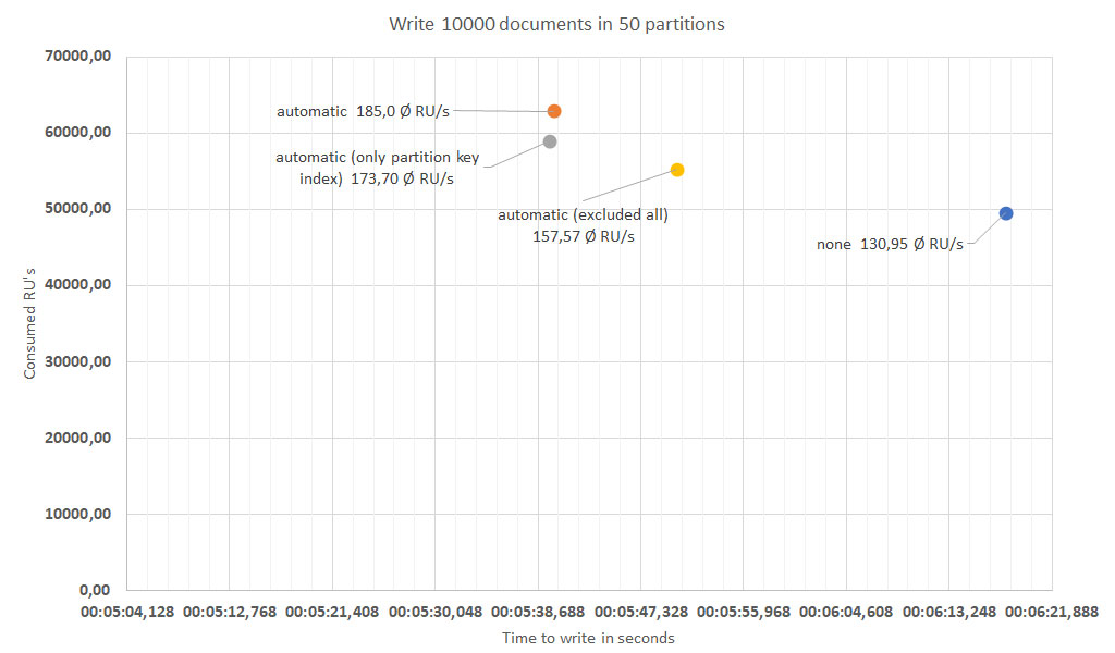 | Indexing policy | Count of Documents | Count of Partitions | Write time | Write RU/s | Average Write RU/s |